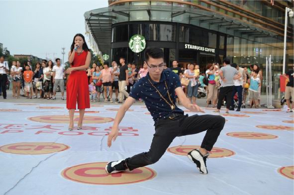 活動時長大約30分鐘,首先快閃人員在王府井南昌路店門口廣場中央集合,穿戴著簡單大方、整齊利索的衣物四處游走在人群中。時間一到,音樂響起,歌手慢慢走近中央,一首振奮人心的“我和你”拉開整個活動的序幕,瞬間引起了在場所有人群的關注。緊接著舞蹈演員閃亮上場,展開了一場激情澎湃的機械舞,帶動現(xiàn)場觀眾情不自禁參與到表演中來,此時人流迅速聚攏,引起圍觀。然后正大食品有限公司員工身著公司服裝,唱著正大集團《愛是正大無私的奉獻》一起出現(xiàn)在廣場中央,隨后幾段歌舞串燒將現(xiàn)場氣氛推向***,在觀眾意猶未盡之時迅速閃開在人群之中?;顒舆^程中穿插進行了分發(fā)公司宣傳材料、食品安全知識宣傳單,現(xiàn)場觀眾品嘗了洛陽正大豬肉調(diào)理品、醬鹵產(chǎn)品及集團現(xiàn)代食品。