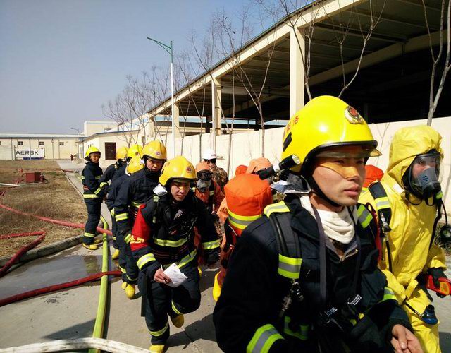 洛陽市消防支隊王榮范參謀長、西工區(qū)消防大隊劉學(xué)康大隊長及洛陽正大總裁辦喬光斌總經(jīng)理、食品事業(yè)部杜光輝副總經(jīng)理一行在演練前到達(dá)演練場地進(jìn)行安排部署,成立了消防演練現(xiàn)場指揮部,由洛陽市消防支隊王榮范參謀長任指揮長。演練假設(shè)正大食品有限公司制冷機(jī)房因設(shè)備發(fā)生故障,液氨罐發(fā)生泄漏,1名操作人員受困,現(xiàn)場人員立即向公司領(lǐng)導(dǎo)匯報并撥打119尋求支援。119指揮中心在接到報警后,由洛陽市消防支隊協(xié)調(diào),迅速調(diào)集澗西消防大隊下屬谷水中隊,西工區(qū)消防大隊下屬車站中隊、紅山中隊迅速趕赴現(xiàn)場,與此同時正大食品有限公司迅速啟動單位應(yīng)急預(yù)案,組織員工疏散。十五分鐘后,紅山消防中隊6臺消防車、2臺救護(hù)車到達(dá)現(xiàn)場,消防戰(zhàn)士著防化服立即進(jìn)入現(xiàn)場,對氨中毒人員進(jìn)行搶救,對氨泄漏部位進(jìn)行應(yīng)急處置。二十分鐘后谷水中隊、車站中隊6臺消防車達(dá)到現(xiàn)場支援, 50余名消防員展開救援戰(zhàn)斗,用消防水槍噴水中和泄漏的氨氣,降低空氣中氨的濃度。經(jīng)過近一個小時的搶維修,氨泄漏得到控制,演練指揮中心宣布本次演練***結(jié)束。