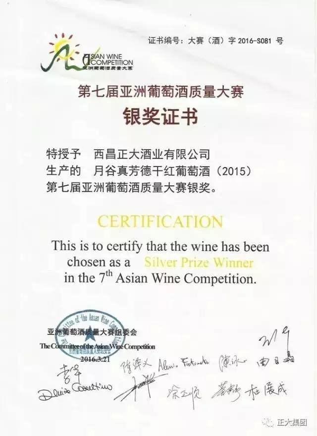 ▲正大酒業(yè)月谷干紅葡萄酒榮獲第七屆亞洲葡萄酒質(zhì)量大賽銀獎(jiǎng)