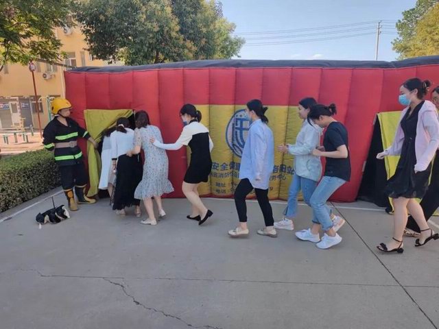 車間、外圍員工逐個體驗應(yīng)急逃生帳篷項目