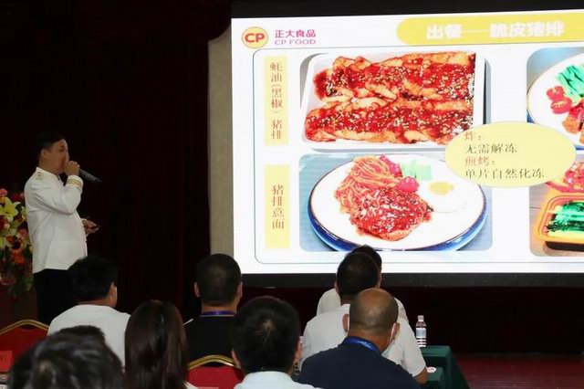 注冊(cè)中國(guó)烹飪大師、洛陽(yáng)正大食品研發(fā)廚務(wù)總監(jiān)張立新先生向團(tuán)餐大會(huì)介紹了洛陽(yáng)正大食品開(kāi)發(fā)的十余款預(yù)制豬肉調(diào)理產(chǎn)品,并從后廚實(shí)操角度分享了產(chǎn)品特色和賣(mài)點(diǎn),逐一介紹了出餐加工標(biāo)準(zhǔn)和配餐流程。